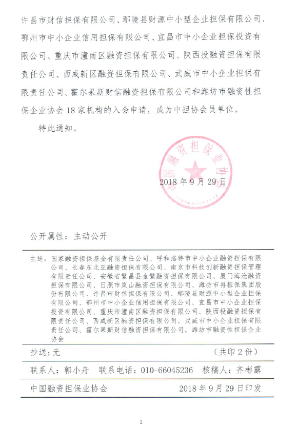 我集團全資子公司長春東北亞融資擔(dān)保有限公司自7月26日注冊成立以來,相繼完成了業(yè)務(wù)流程設(shè)計、制度體系搭建、人員招聘、軟硬件設(shè)施建設(shè)等一系列業(yè)務(wù)開展前期準備工作。為了及時把握政策動態(tài),提高公司規(guī)范化管理水平,加強與業(yè)內(nèi)其他機構(gòu)的交流與協(xié)作,擔(dān)保公司向中國融資擔(dān)保業(yè)協(xié)會遞交了成為會員單位的申請。9月29日,擔(dān)保公司收到了《中國融資擔(dān)保業(yè)協(xié)會關(guān)于批準東北中小企業(yè)信用再擔(dān)保股份有限公司等23家機構(gòu)成為副會長、理事、會員單位的通知》,正式成為中國融資擔(dān)保業(yè)協(xié)會會員單位。